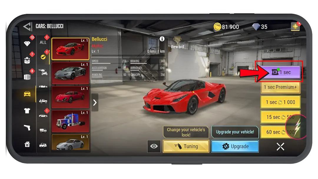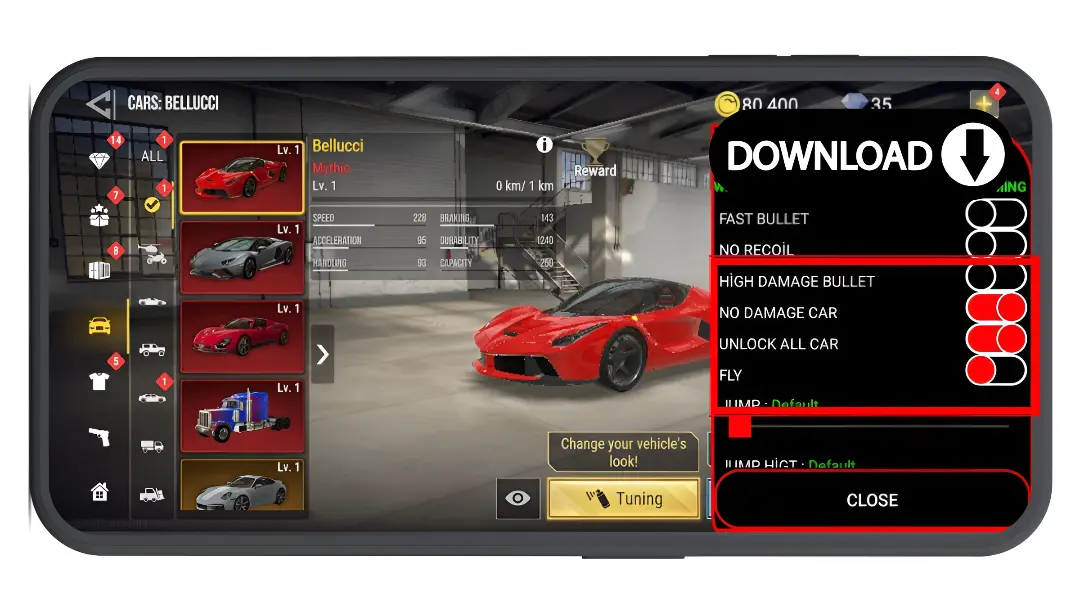 Go to the mod icon and enable the unlocked cars and any other premium items you would like to access, such as unlimited ammo.